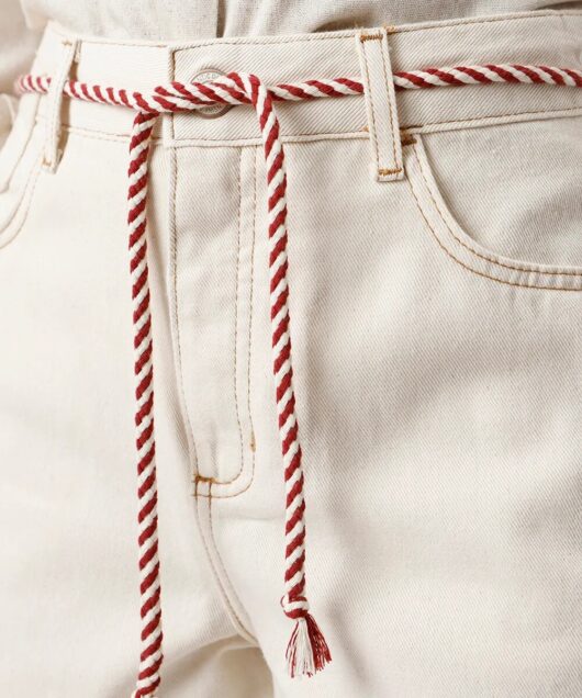 Para um visual casual e fresco, combine com camisa feminina de manga curta ou t-shirt básica e rasteirinhas. Se quiser um toque mais arrumado, use com body ajustado, blazer e sandália de salto bloco. O cordão pode ser substituído por um cinto de couro para transformar o look.